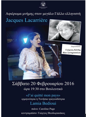 GK: Tout à fait ! C’est pourquoi nous participons à l’organisation des événements culturels souvent avec les amis d’autres pays qui habitent l’Argolide. Un magnifique exemple est celui du grand helléniste Jacques Lacarrière qui a voyagé pendant des années en Grèce, il nous a offert en héritage le magnifique récit de ses voyages au titre «L’été grecque » (1976) et il n’a jamais voulu quitter la Grèce même à sa mort : sa volonté était que ces cendres soit éparpillées en mer Egée et le 3 novembre 2005 on a accompli sa dernière volonté au large de Spetses. Nous avons aussi une de meilleure description de l’ancienne théâtre d’Epidaure et de la population locale quand il est venu avec les étudiants de Sorbonne, en 1947 déjà, jouer « Les Perses » d’Eschyle. A son honneur nous avons organiser une soirée a Nauplie, ou nous avons présenté sa vie et son œuvre, son amour pour la Grèce et nous avons écouté des belles chansons par une magnifique voix d’une chanteuse tunisienne aussi installée à Athènes, Lamia Bedioui.