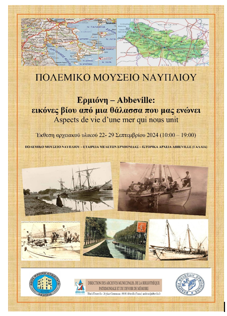 GK: Je crois que notre dernière exposition au musée militaire de Nauplie (2024) est la plus représentative de nos efforts à relier les différentes expériences culturelles en Argolide. Parmi les villes européennes avec lesquelles nous avons des échanges, ceux d’Abbeville du nord de la France, sont les plus privilégiés vu l’intérêt que portent aussi nos amis abbevillois à ces échanges. Je signale le jumelage de cette belle et historique ville française avec la ville d’Argos qui permet d’étendre nos activités et relations avec d’autres villes aussi. Ainsi, nous avons travaillé sur le thème des communautés maritimes qui était déjà le sujet d’une exposition des archives municipales d’Abbeville (Direction des Archives Municipales, de la Bibliothèque Patrimoniale et du Devoir de Mémoire). Nous avons lié ces Archives Municipales et la Société d’Εtudes d’Ermionide pour arriver à une étude comparative de l’histoire maritime de deux villes et régions sous le titre : Aspects de vie d’une mer qui nous unit.