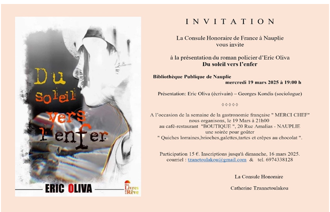 En plus, nous avons un nombre croissant d’écrivains qui s’installent en Argolide. Nous sommes aussi à la rencontre de ses personnes pour échanger, les mettre en relation avec les écrivains locaux et faire connaitre au grand public leurs écrits (romans, etc). Il y a quelques jours, nous avons présenté le roman policier d’Eric Oliva à la Bibliothèque Publique de Palamidis à Nauplie. Le couple Oliva est installé à Dimaina (Epidaure) depuis quelque temps. Eric est écrivain des romans policiers. Plus de 50 titres sont déjà répertoriés avec sa signature et, en 2014, il a reçu en France le Prix Fondcombe pour le roman « Le soleil vers l’enfer » que nous avons présenté en collaboration avec la Consule Honoraire de France à Nauplie Mme Catherine Tzannetoulakou. De cette façon nous inaugurons un nouveau domaine d’échanges culturels, espérant que nous allons aider de cette manière à rapprocher le public local mais aussi les écrivains et artistes locaux avec ceux d’autres pays.
