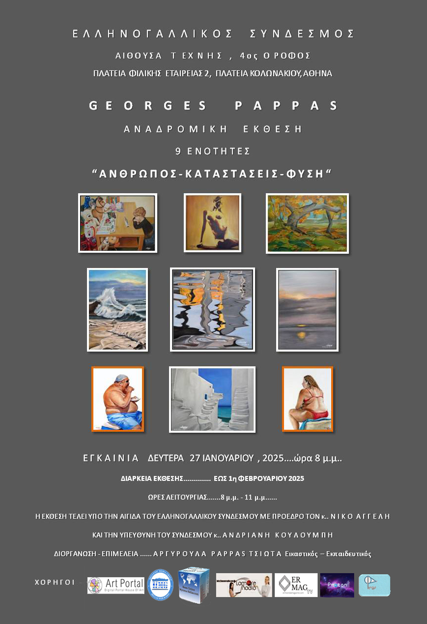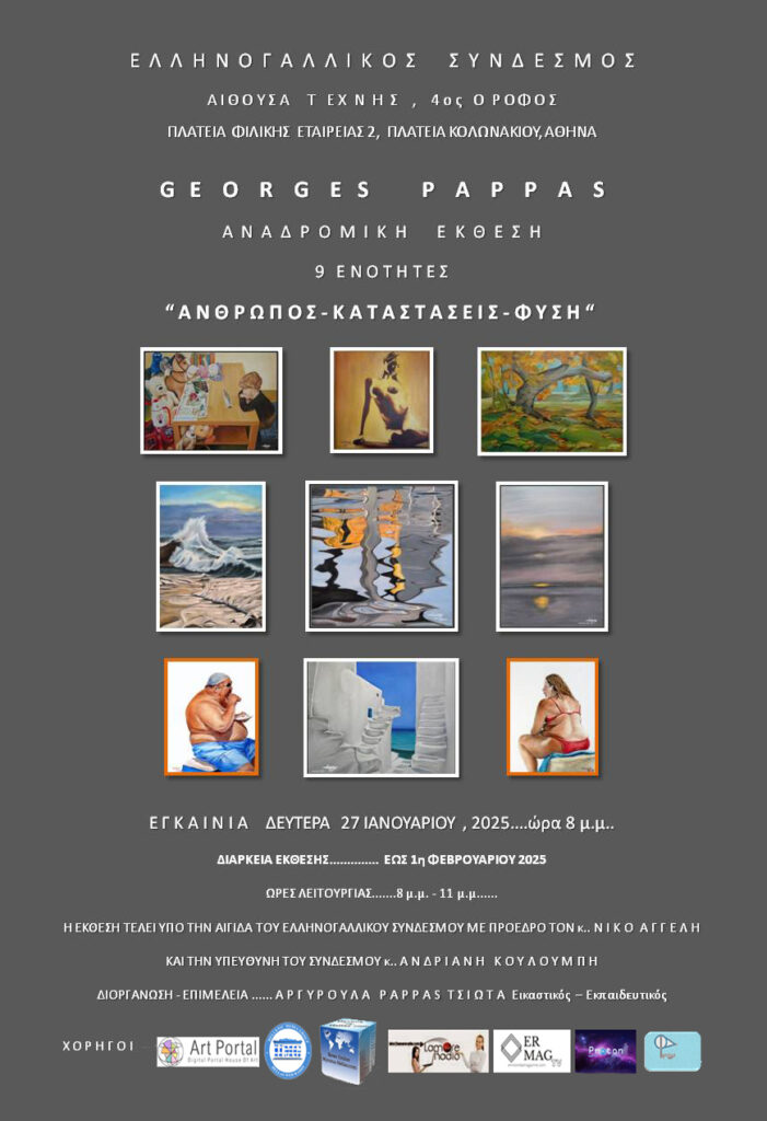 Ενόψει της παρουσίασης αναδρομικής έκθεσης ζωγραφικής του αρχιτέκτονα-εικαστικού Georges Pappas – Chevalier de l’Ordre des Palmes Academiques – Architecte D.P.L.G., θα πραγματοποιηθούν τα εγκαίνια την Δευτέρα 27 Ιανουαρίου 2025, στις 8.μ.μ. στην αίθουσα τέχνης του Ελληνογαλλικού Συνδέσμου, Πλατεία Φιλικής Εταιρείας 2, 4 ος όροφος, Πλατεία Κολωνακίου, Αθήνα.