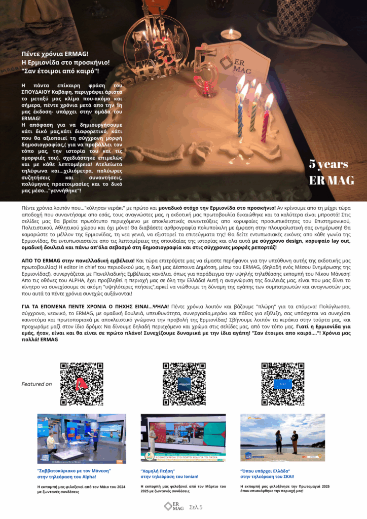ΓΙΑ ΤΑ ΕΠΟΜΕΝΑ ΠΕΝΤΕ ΧΡΟΝΙΑ Ο ΠΗΧΗΣ ΕΙΝΑΙ…ΨΗΛΑ! Πέντε χρόνια λοιπόν και βάζουμε “πλώρη” για τα επόμενα! Πολύγλωσσο, σύγχρονο, νεανικό, το ERMAG, με ομαδική δουλειά, υπευθυνότητα, συνεργασία, μεράκι και πάθος για εξέλιξη, σας υπόσχεται να συνεχίσει καινοτόμα και πρωτοποριακά με αποκλειστικό γνώμονα την προβολή της Ερμιονίδας! Σβήνουμε λοιπόν τα κεράκια στην τούρτα μας, και προχωράμε μαζί στον ίδιο δρόμο: Να δίνουμε δηλαδή περιεχόμενο και χρώμα στις σελίδες μας, από τον τόπο μας. Γιατί η Ερμιονίδα για εμάς, ήταν, είναι και θα είναι σε πρώτο πλάνο! Συνεχίζουμε δυναμικά με την ίδια αγάπη! “Σαν έτοιμοι απο καιρό….”! Χρόνια μας πολλά! ERMAG
