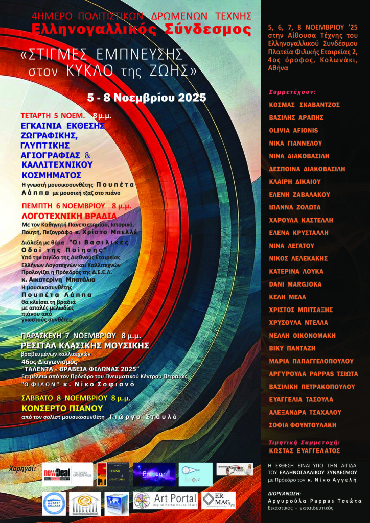Πραγματοποιείται 4ήμερο Πολιτιστικών Δρώμενων Τέχνης στην αίθουσα τέχνης του Ελληνογαλλικού Συνδέσμου. Πλατεία Κολωνακίου 2, στα πλαίσια της 13ης Φθινοπωρινής Εορταστικής Εικαστικής συνάντησης, από 5 έως και 8 Νοεμβρίου 2025 υπό την αιγίδα του Προέδρου του Ελληνογαλλικού Συνδέσμου κ. Νίκου Αγγελή και την στήριξη της υπεύθυνης του Συνδέσμου κ. Ανδριάνας Κουλουμπή.